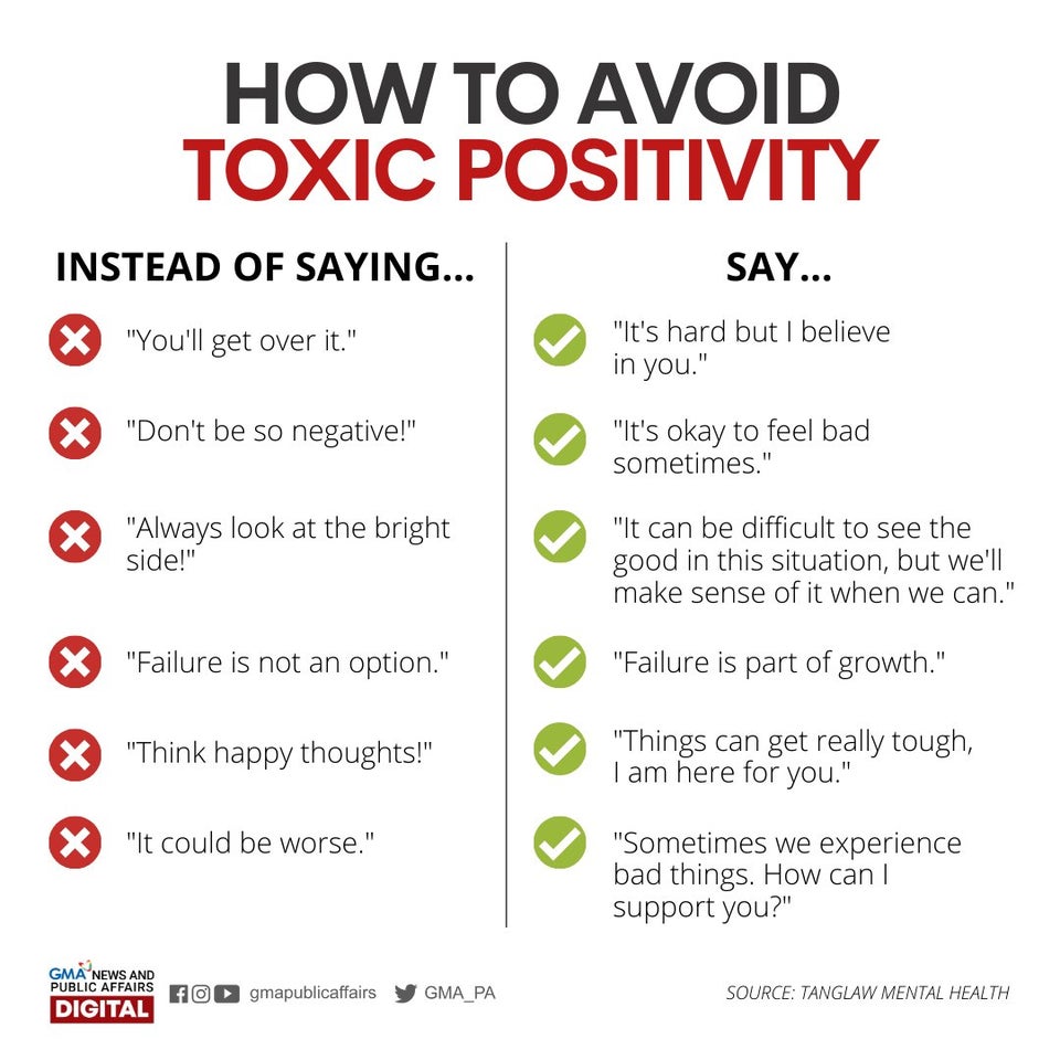 - Be open to learning about and changing toxic positivity habits – you might not even realize that you are engaging in toxic positivity! That is okay, as long as you are willing to be open to learning and changing to be better. If any of these statements below sound like things you might have said in the past, I recommend you do a bit of reading into how else toxic positivity might show up in your life. Perhaps try reaching out to some friends to see how they’re REALLY doing. Minimize posting on social media encouraging people to be positive and “thankful” during this time when people collectively are experiencing hardships on top of their potential individual hardships (you can do it once in a while but if you do it very often it seems like thankfulness and positivity is the only option). Try exploring some of your own negative thoughts and emotions – is there stuff that you are trying to push down in the name of positive vibes? And lastly be open to hard conversations with friends, whether its about your own emotions, the emotions of your loved ones, or emotional topics such as racism, homophobia etc