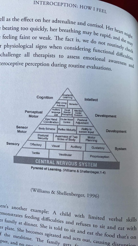 This book however, written by Cara N Koscinski, was wonderful! It talks about the importance of working with interoception as an OT and recognizing that lack of internal awareness can play a huge role in many of the goals our clients are working towards!