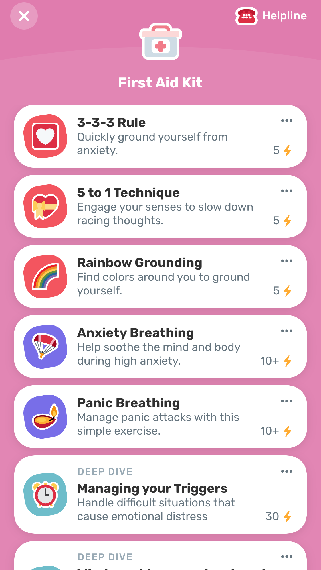 The app also has some different categories of support areas that you can explore- please keep in mind that these are not a replacement for therapy but are to help in harder moments as strategies. For example, you can explore the breathing section which will guide you through therapeutic breath, try different movements that are guided, reflections to guide mindfulness and try out different acts of kindness. There is a quiz section, which should not be a replacement for assessment or diagnosis from a professional, but can be helpful as a reminder or check in with self as to where you are mentally in the moment. There is also a first aid kit section, which provides some grounding and mindful activities that you can use in moments of high stress to help bring yourself a little closer to calm.