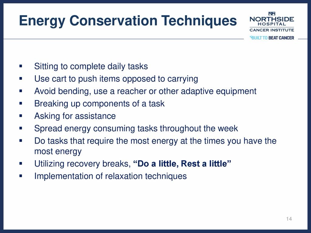 Energy conservation is a technique that can help you adapt the way you complete your daily activities so that you use less energy, feel less tired and put less strain on your body.