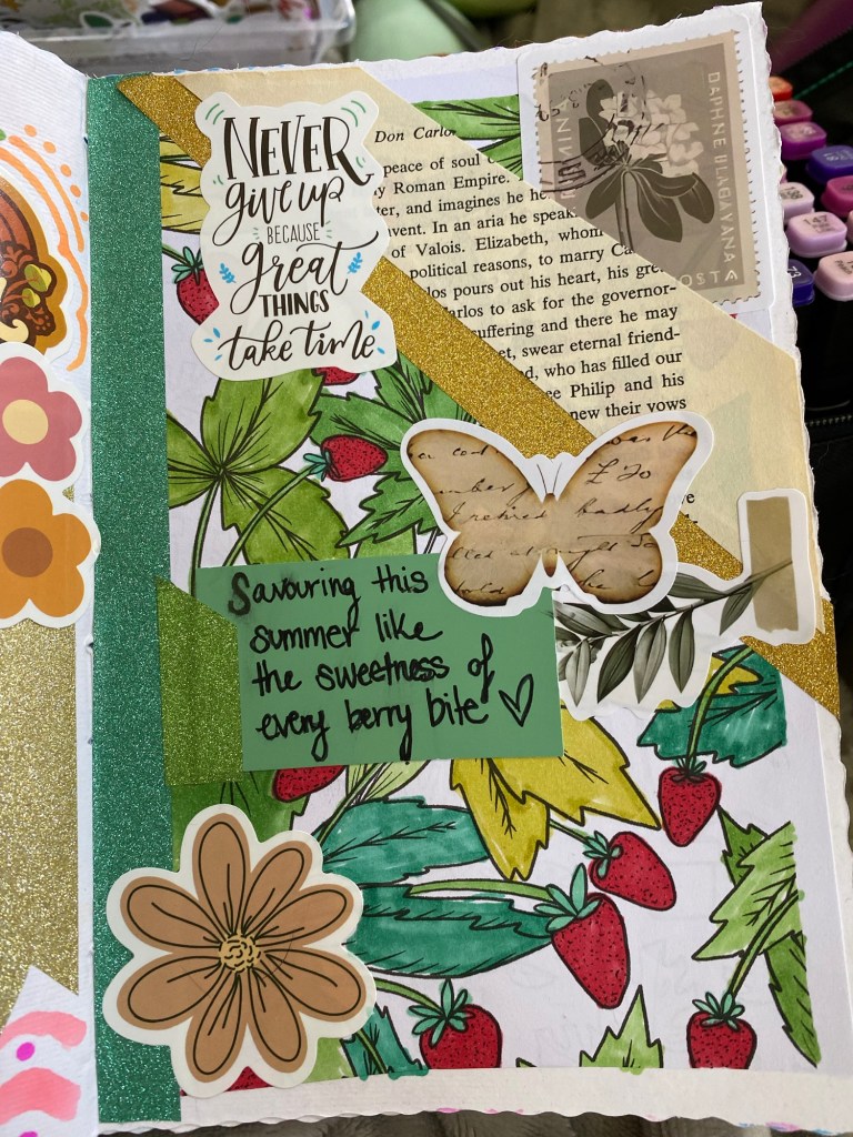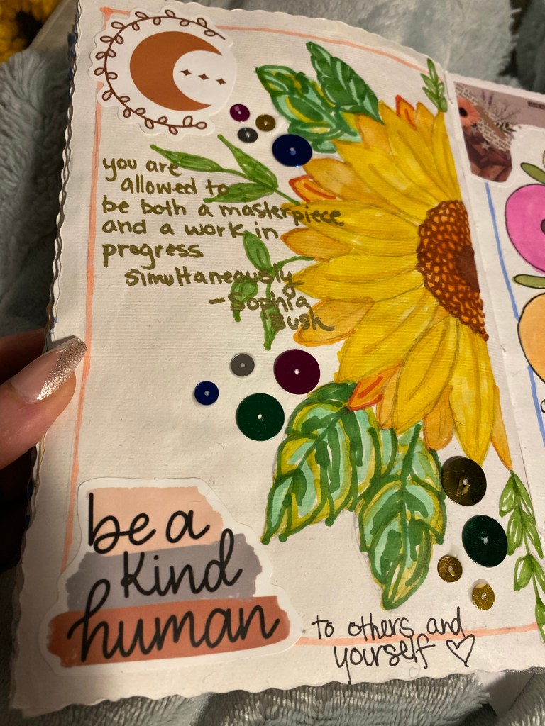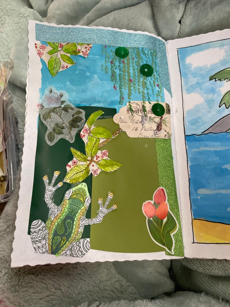 In the past few months I have really connected with Junk journaling or art journaling (depending on how you approach it), in order to express how I am feeling. Painting and art are some of my coping tools and interests, and with junk/art journalling, I feel less pressured to make something incredible because it is just in a book! I will add some pictures of my art to show how I approach this journal style, but you can find so many different versions on social media and make this your own!