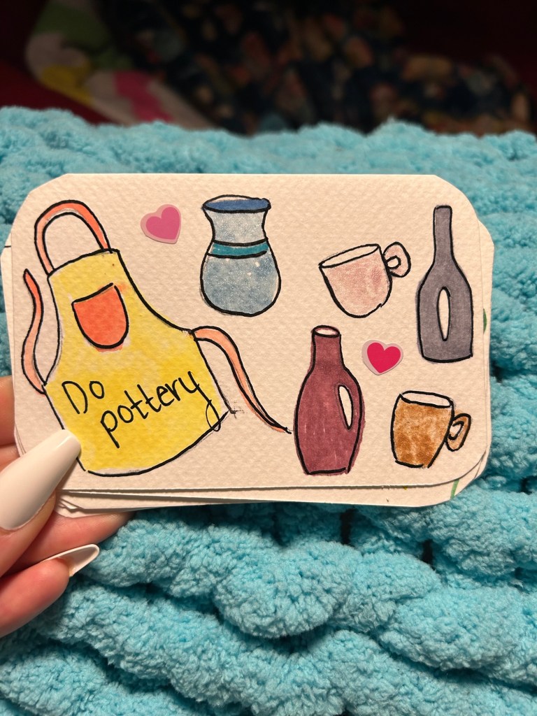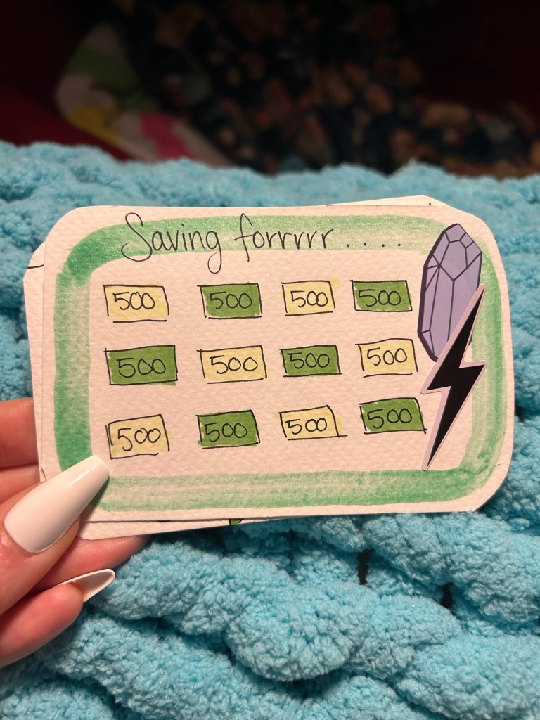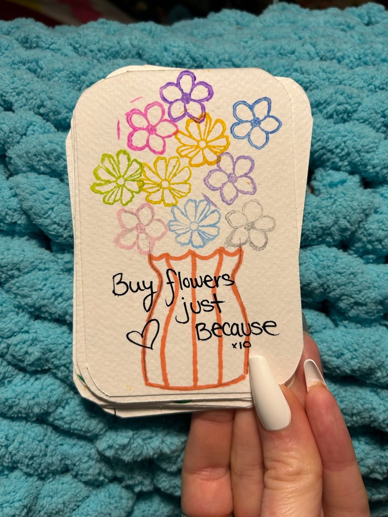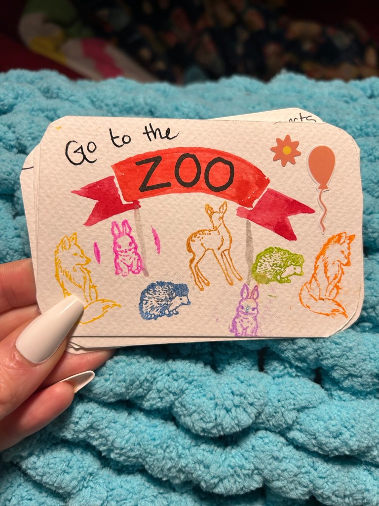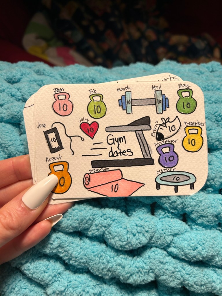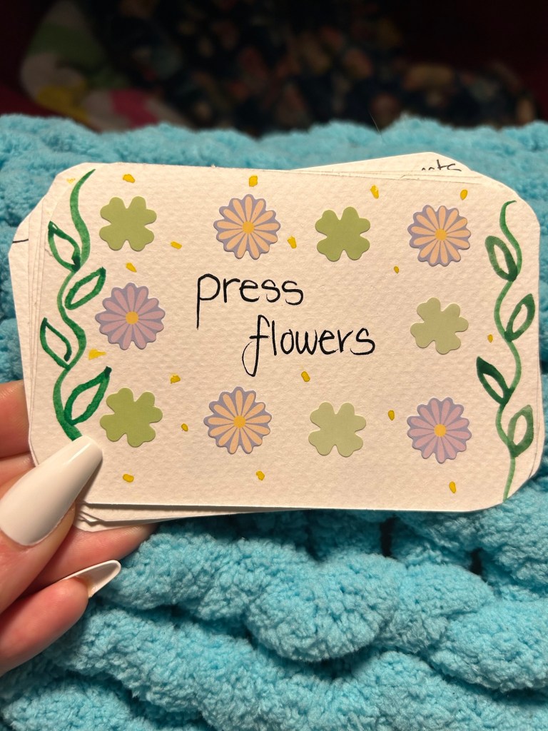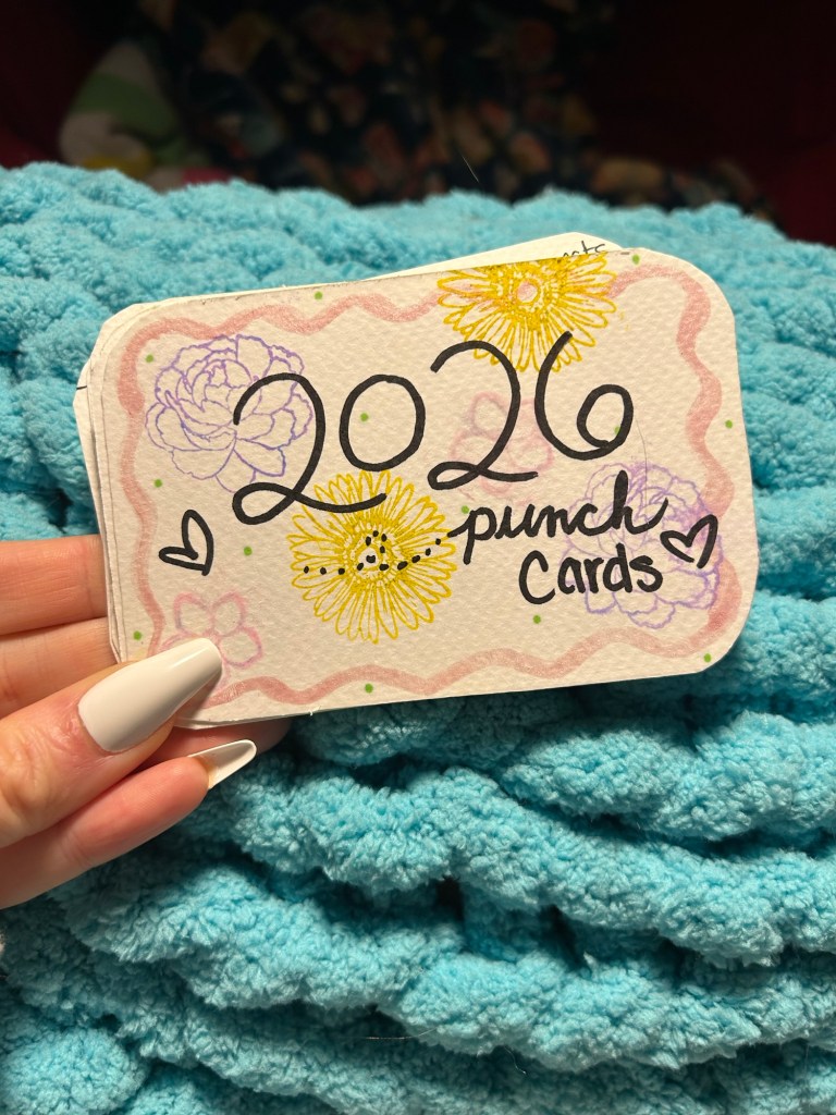 Tik tok is featuring so many of these cute goal punch cards as a crafty goal setting activity, you may have seen them while scrolling already! But here are my cards and some steps of HOW TO make yours too! There should never be specific rules you feel you have to follow when you are making goals, only things that you feel gives you purpose and things you want to do. However we set a rule which was to find goals that are achievable and enjoyable. If you take a look at my goals on my cards, they are things that would help me thrive but also help me feel joy and support my mental health despite the chaos of life.